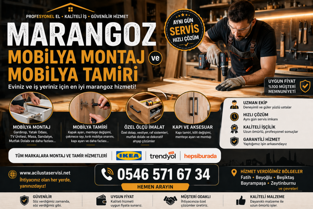 Evinizde ya da iş yerinizde en çok zaman geçirdiğiniz alanlar, konforlu ve estetik mobilyalarla donatıldığında yaşam kaliteniz artar. Ancak bu mobilyaların üretimi, kurulumu ve zamanla oluşabilecek hasarlarının tamiri için uzman bir desteğe ihtiyaç duyarsınız. İstanbul’un merkezi ilçeleri olan Fatih, Şişli, Beyoğlu, Beşiktaş ve çevresinde, marangoz, mobilya montajı, özel mobilya imalatı ve mobilya tamiri hizmetlerinde tecrübeli ve güvenilir bir ekip arıyorsanız, doğru yerdesiniz! Acil Usta Servisi olarak yılların verdiği deneyim, profesyonel ekipmanlarımız ve çözüm odaklı yaklaşımımızla her türlü ahşap ve mobilya ihtiyacınızı karşılıyoruz.
