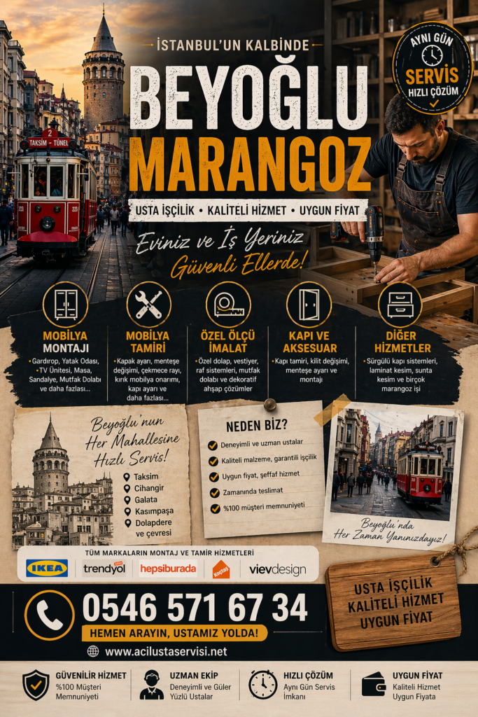 İstanbul’un en yoğun bölgelerinden biri olan Beyoğlu’nda marangoz hizmeti arıyorsanız doğru yerdesiniz. www.acilustaservisi.net olarak Beyoğlu ve çevresinde mobilya montajı, mobilya tamiri ve özel ölçü marangozluk işlerinizde hızlı, güvenilir ve profesyonel çözümler sunuyoruz. Aynı gün servis imkanıyla bulunduğunuz konuma en yakın marangoz ekibimizi yönlendiriyoruz.