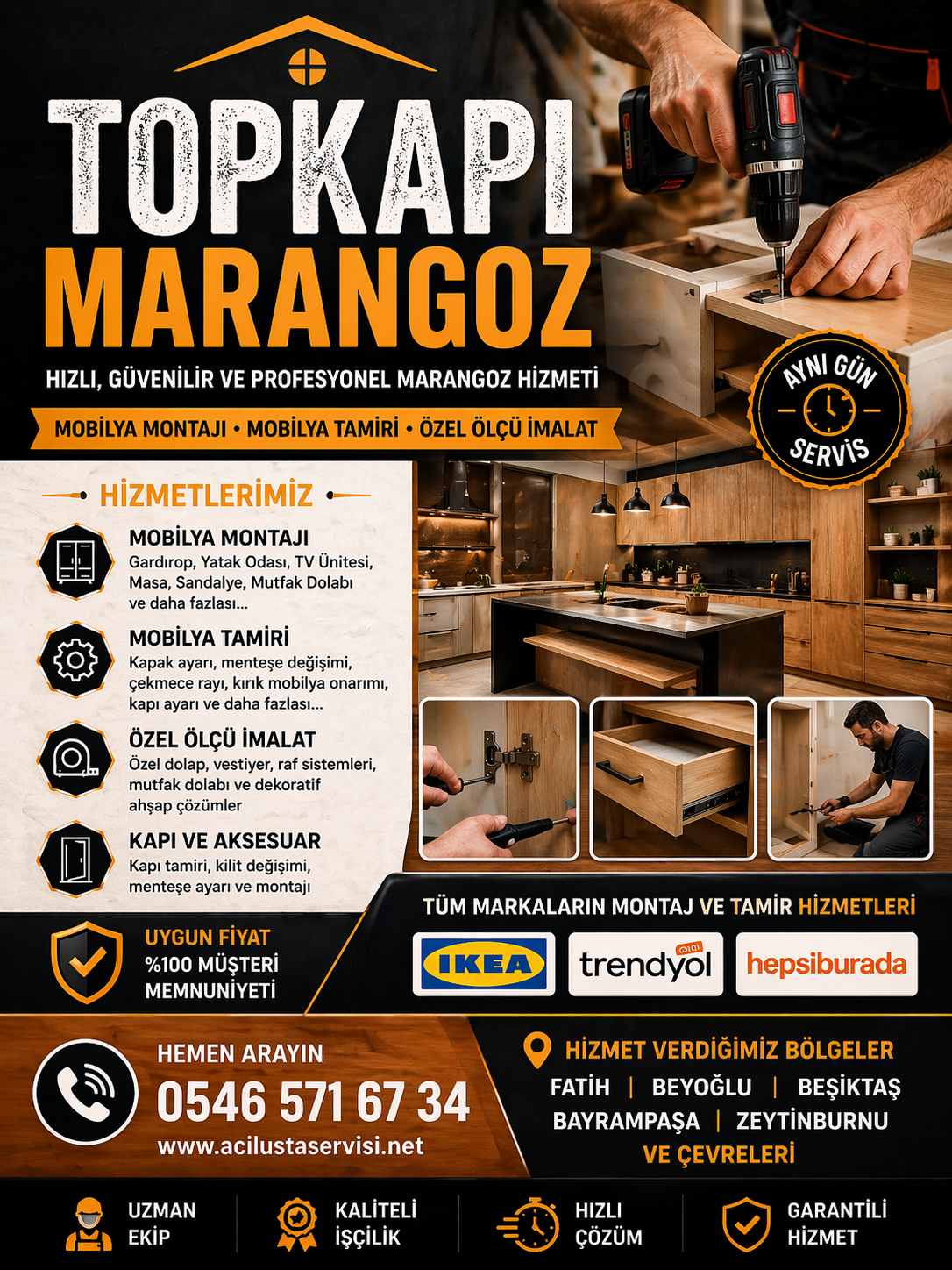 Topkapı marangoz bölgesinde özellikle Koçtaş, IKEA, Vivense, Trendyol ve Hepsiburada üzerinden alınan paket mobilyaların kurulumu sıkça istenir.